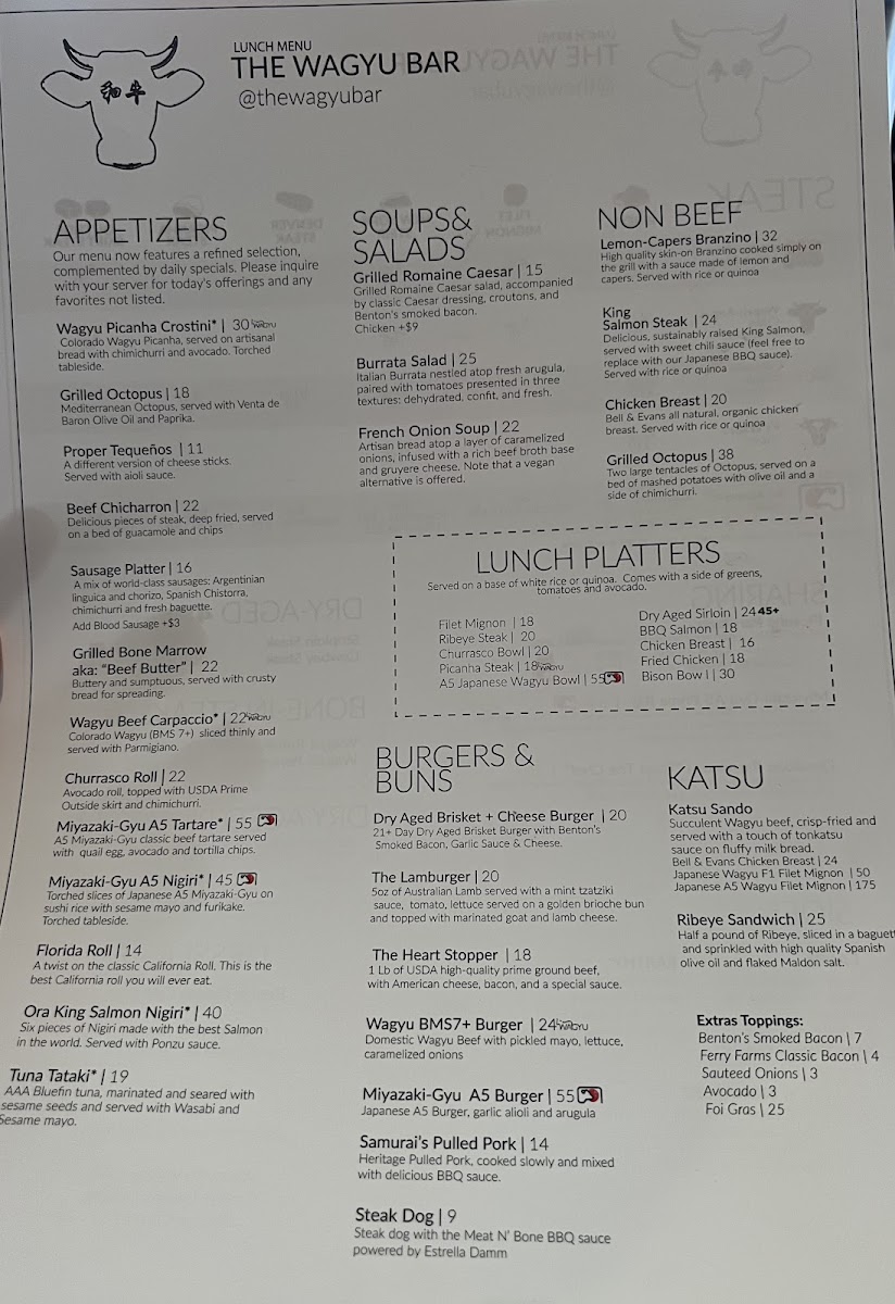 Each dish on the menu at The Wagyu Bar is crafted with quality ingredients, offering a memorable dining experience in the heart of Miami. Whether you opt for a rich steak platter or a delicious lunch bun, the menu promises something for everyone, satisfying both the craving for high-end cuts of meat and more casual yet equally flavorful bites.